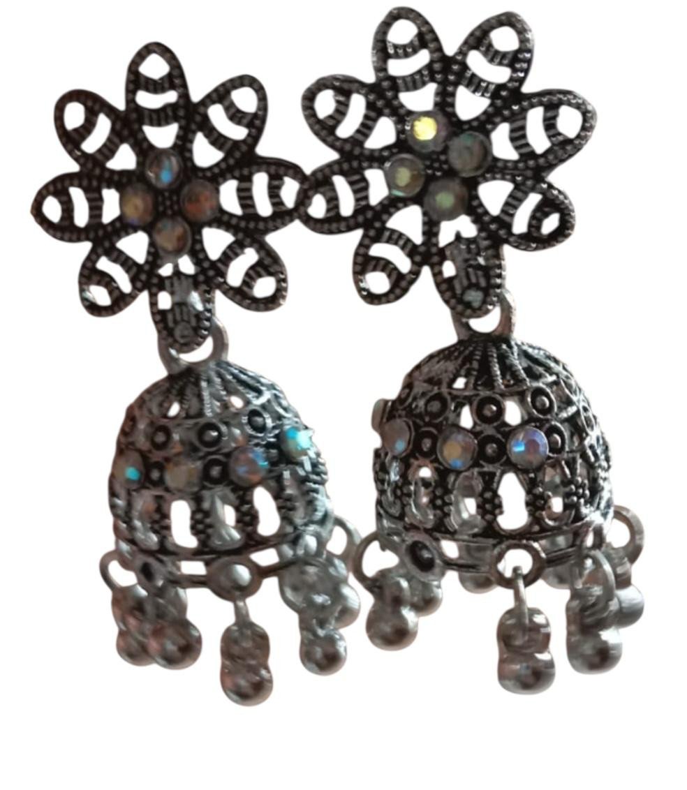 Design: Beautiful floral stud top with intricate cutwork, adorned with shimmering stones, paired with a dome-shaped oxidised jhumka.