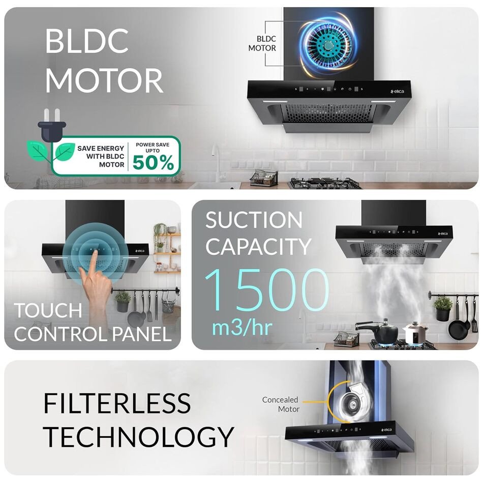 The filterless technology with heat auto-clean function ensures hassle-free maintenance, while the oil collector tray makes cleaning easy. With motion sensor control, you can operate the chimney with just a wave of your hand, combining convenience with sophistication. Its sleek Matte Black (Nero) finish adds elegance to your cooking space.