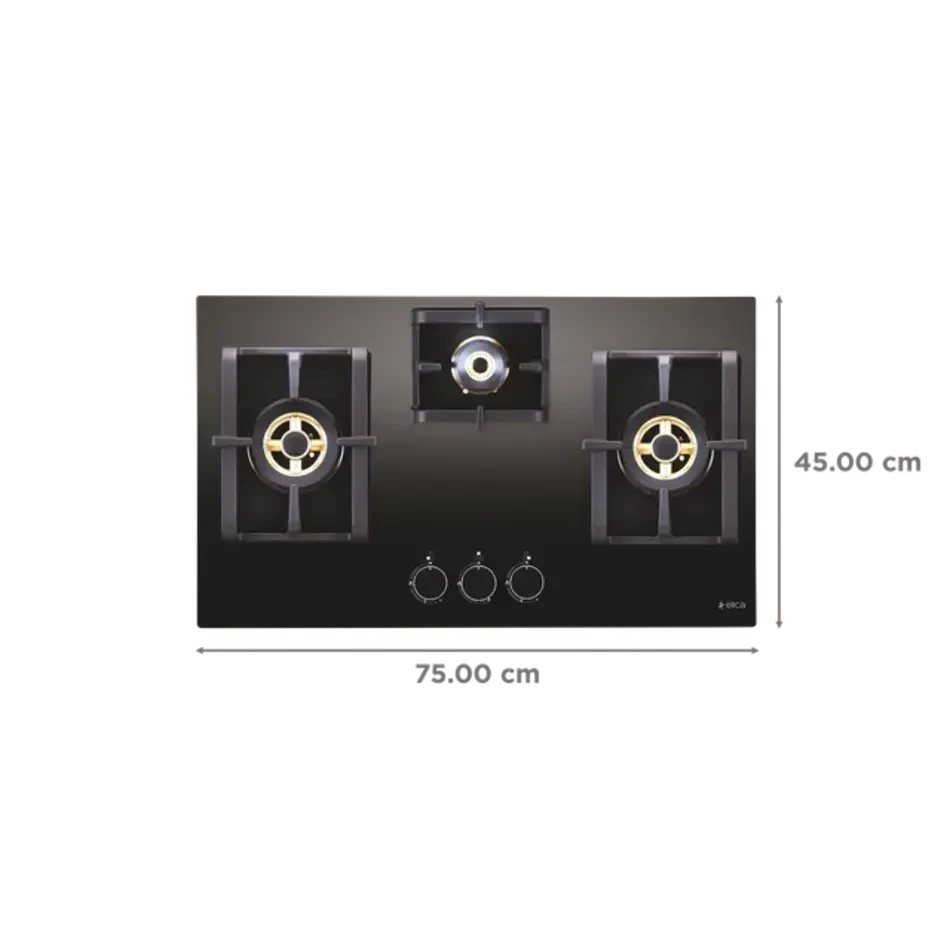 The Auto Ignition System ensures hassle-free operation, while the Flame Failure Device (FFD) enhances safety by automatically shutting off gas in case the flame goes out. Built with 8 mm black toughened glass, heavy-duty cast iron pan supports, and ergonomic metal knobs, this hob combines durability with a sleek, modern design.