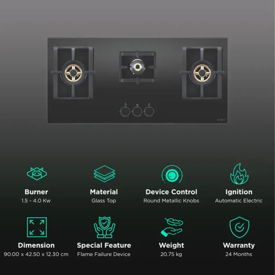 The Flame Failure Device (FFD) ensures maximum safety by automatically cutting off the gas supply if the flame goes out, while auto ignition adds convenience and efficiency. Built with premium black glass and durable cast iron pan supports, it’s a blend of luxury, safety, and functionality — a true centerpiece for your modular kitchen.
