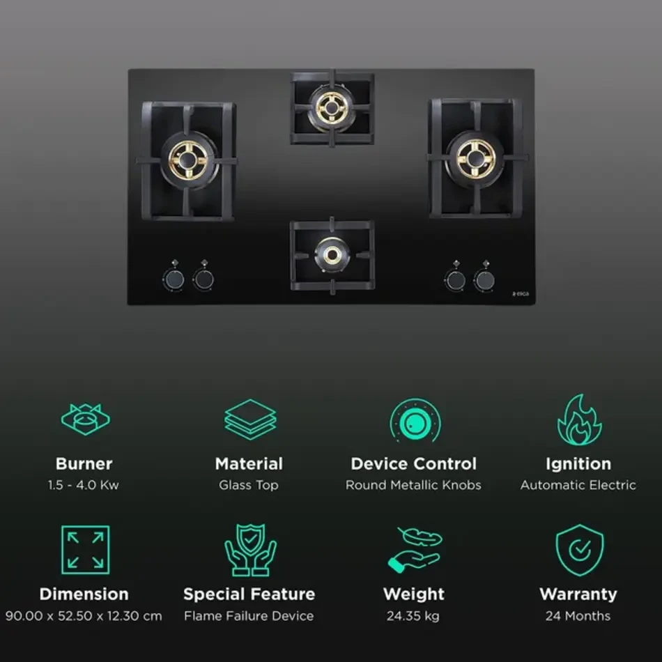 The auto ignition system ensures smooth and instant start-up, while the Flame Failure Device (FFD) provides advanced safety by cutting off gas supply in case of flame extinguishing. Its premium 8 mm black toughened glass top adds durability and style, complemented by cast iron pan supports for steady utensil placement and ergonomic metal knobs for effortless control.
