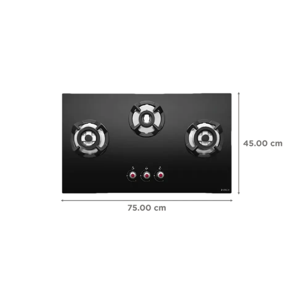 Its sleek black toughened glass surface, cast iron pan supports, and ergonomic metallic knobs add durability and modern elegance to your kitchen space. Equipped with auto electric ignition, this hob ensures safe and convenient cooking every day.