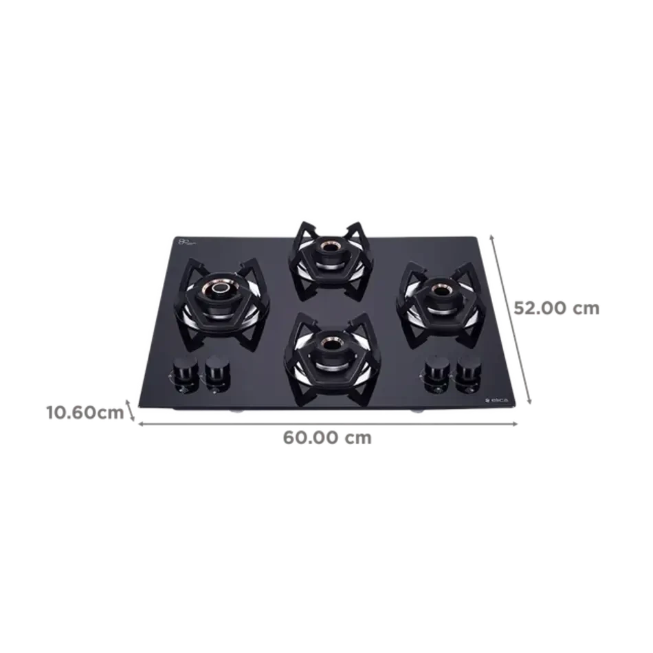 The sleek black toughened glass finish adds elegance while offering easy cleaning, and the cast iron pan supports provide stability for all cookware. With auto electric ignition and ergonomic metallic knobs, it combines safety, performance, and style in one appliance.