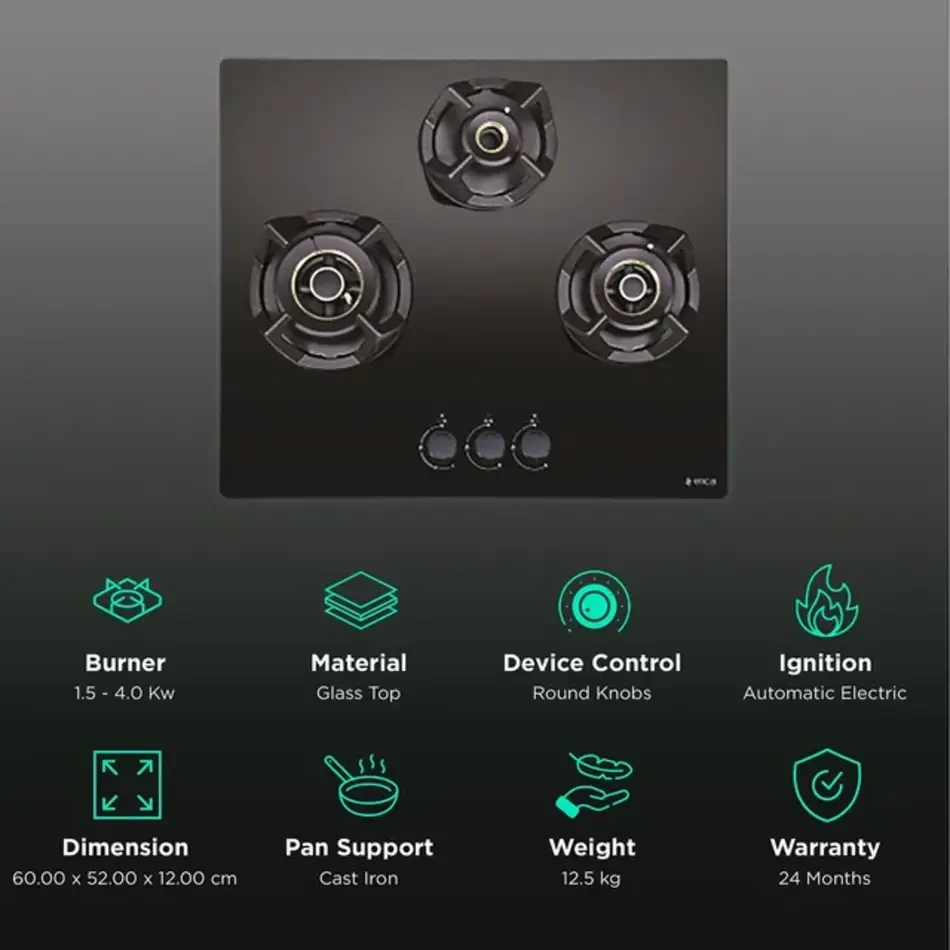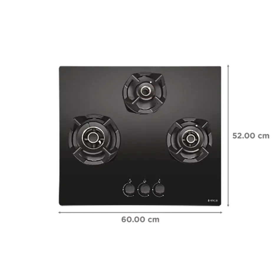 With its sleek black toughened glass finish, cast-iron pan supports, and ergonomic metallic knobs, it blends durability with elegance. The auto electric ignition ensures ease of use, making everyday cooking seamless.