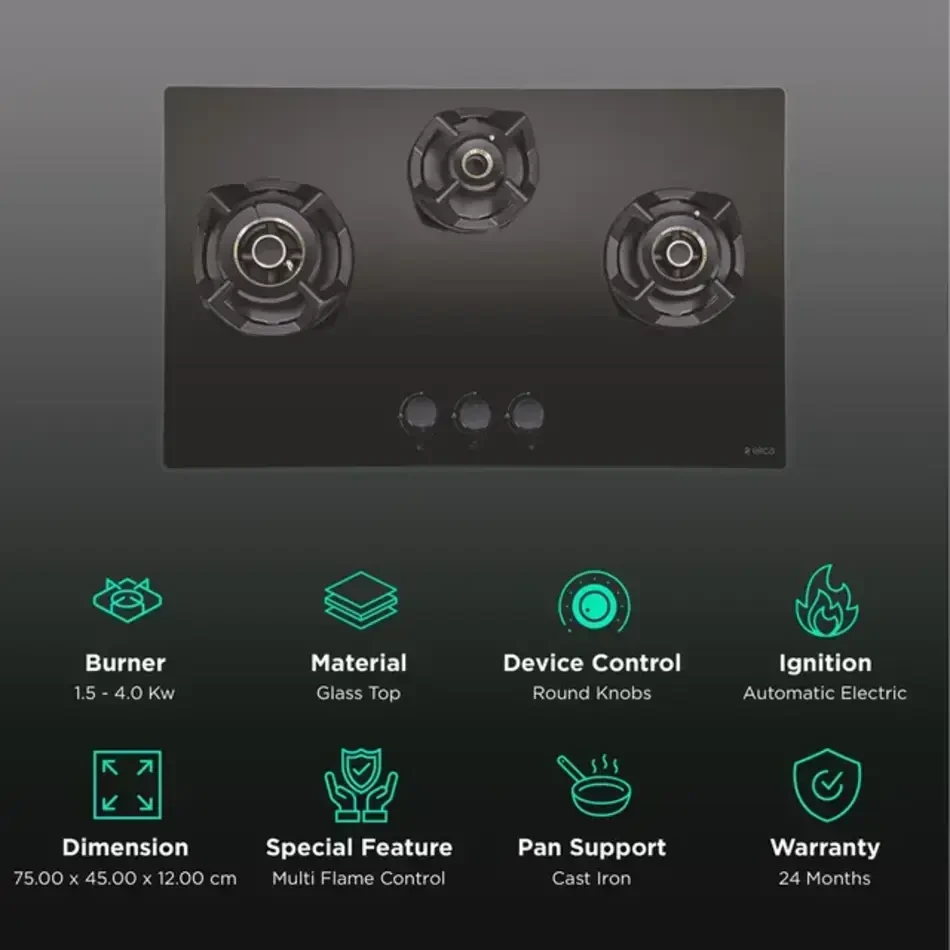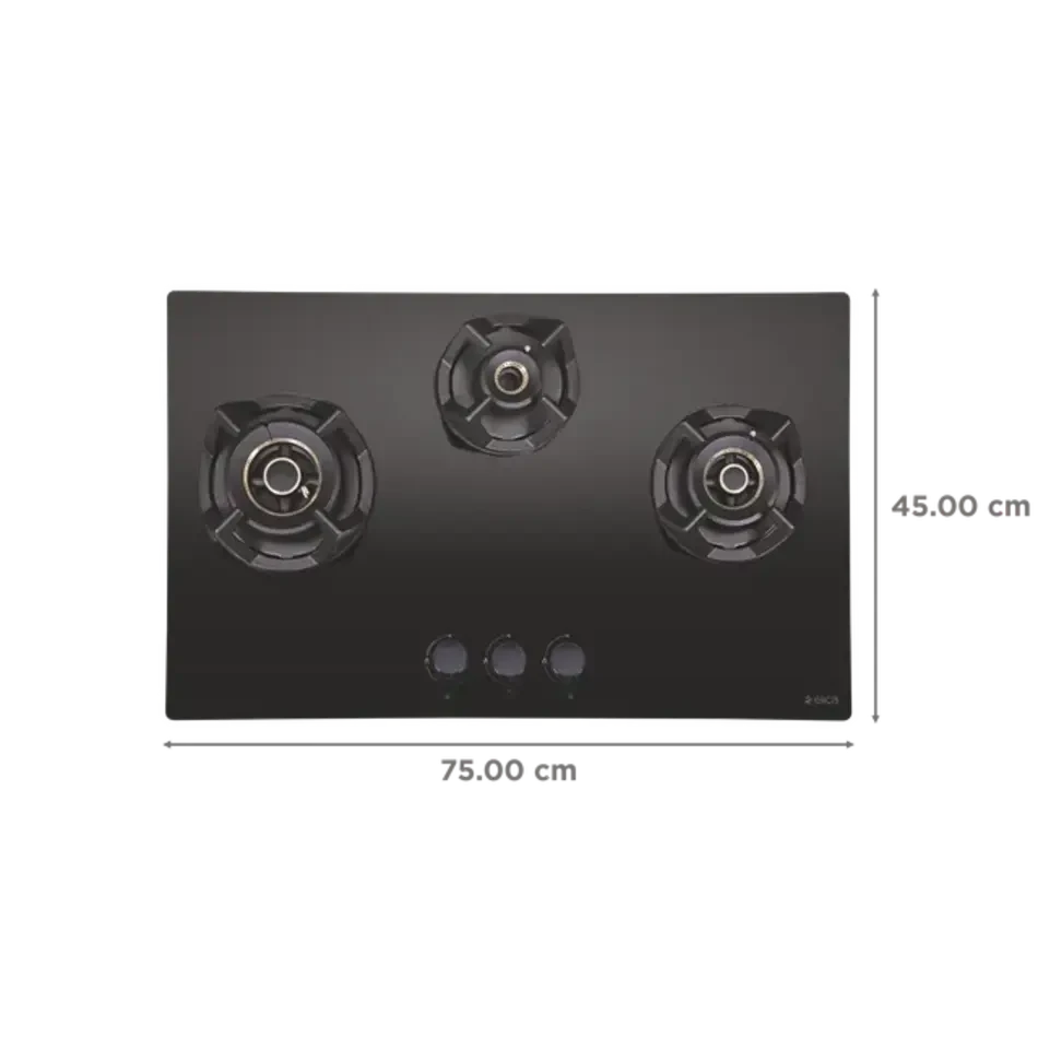 The sleek black toughened glass top adds a refined aesthetic to your kitchen, while auto electric ignition and ergonomic metal knobs make operation smooth and convenient.