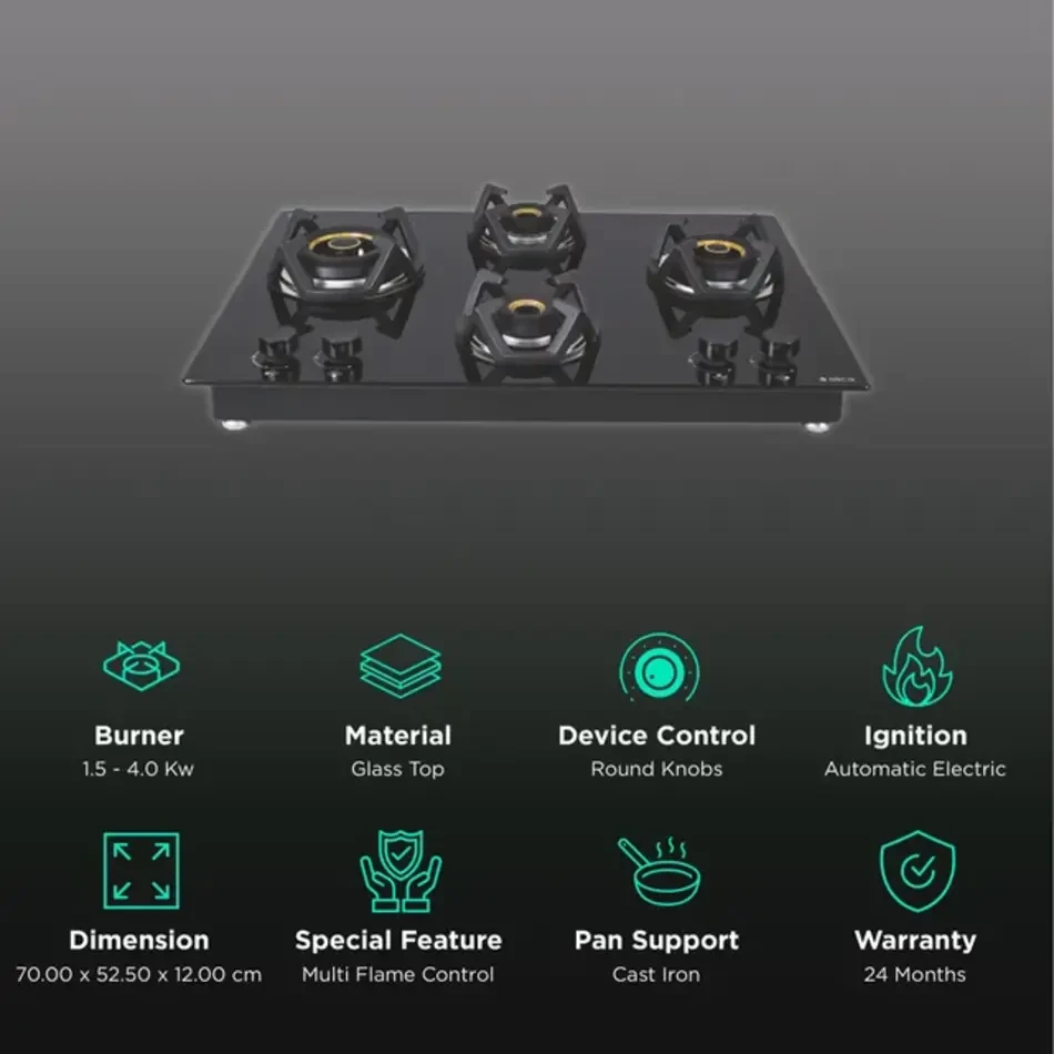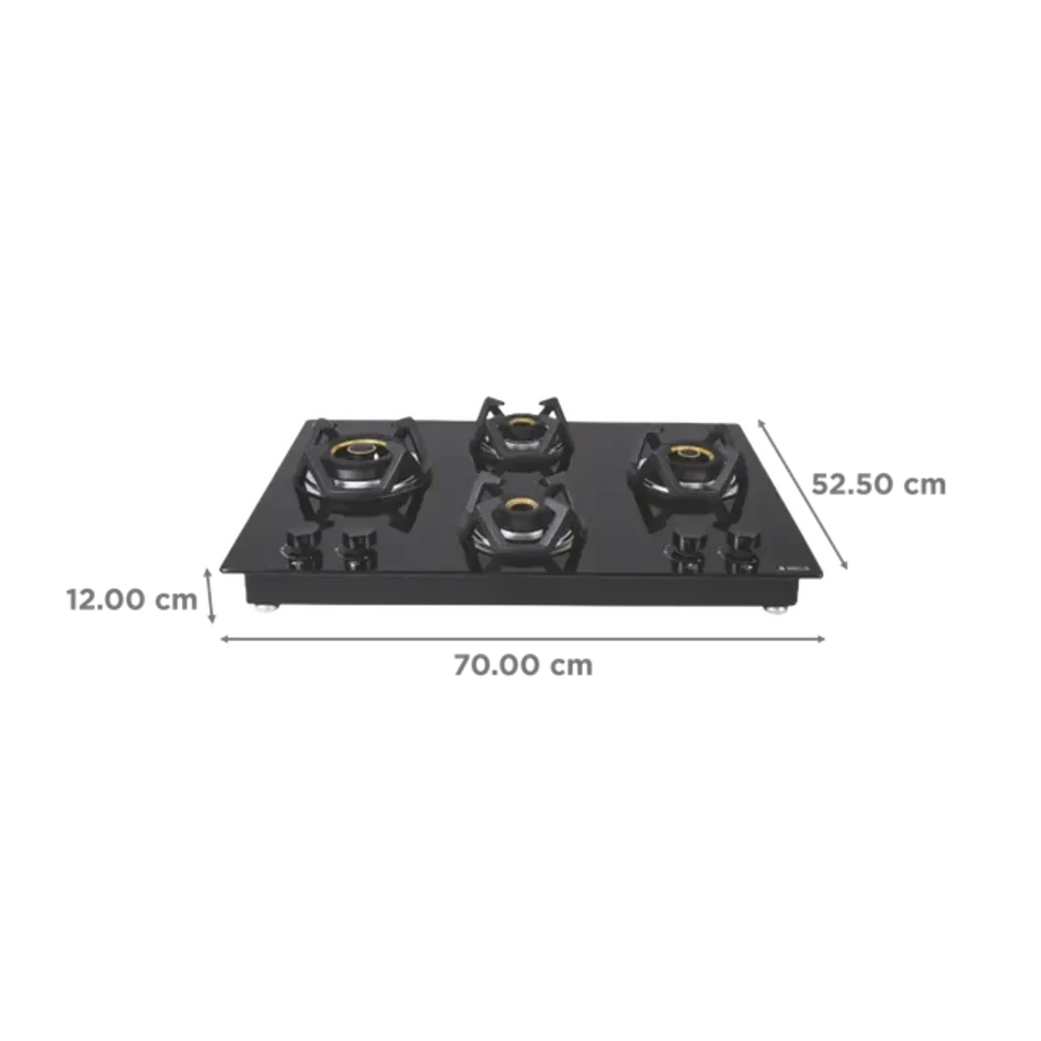 The toughened matte finish glass top ensures durability and a sleek, modern look, while the auto electric ignition makes cooking more convenient. Featuring 4 brass burners—including 2 large, 1 medium, and 1 small burner—this hob allows efficient multi-tasking with consistent flame control.