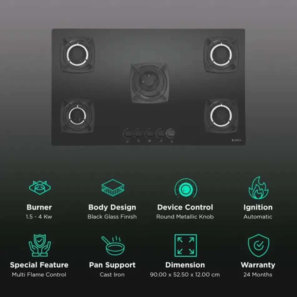 This hob is equipped with five multi-flame Italian brass burners — including high flame, medium, and auxiliary — to handle everything from fast stir-frying to slow simmering with efficiency. Its cast iron pan supports ensure stability for all cookware sizes.