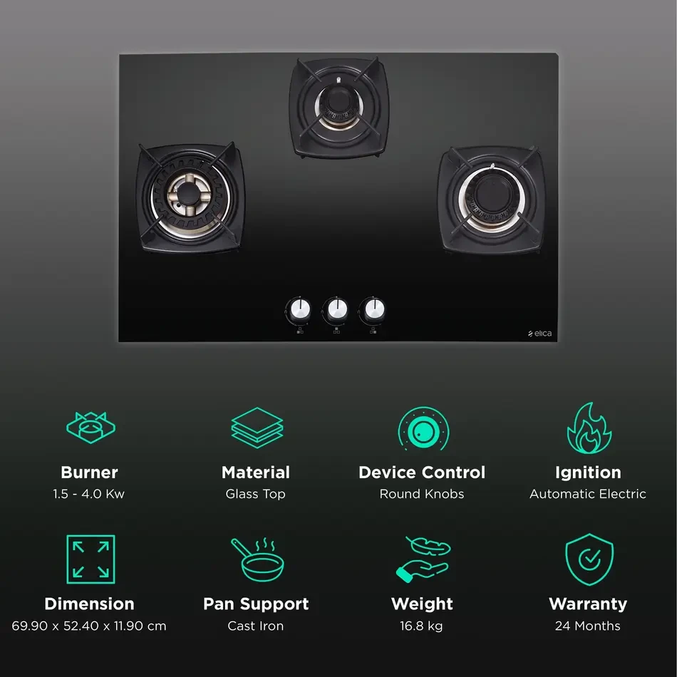 The Elica DT MFC 3B 70 Swirl is a premium 3-burner built-in hob engineered for modern kitchens. Featuring a sleek black glass top finish, cast iron pan supports, and multi-flame brass burners (4.0 kW + 2.2 kW + 1.5 kW), this hob delivers powerful and efficient cooking performance