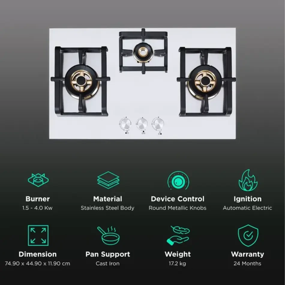 The Elica INOX PRO FB MFC 3B 75 DX FFD is a stylish and compact 75 cm built-in hob designed to bring Italian elegance and powerful performance to modern kitchens. Featuring three high-efficiency brass burners, including a triple-ring burner on the right-hand side, it is perfect for multitasking and heavy-duty cooking. Its auto electric ignition system and round metallic knobs ensure convenience, while the Flame Failure Device (FFD) guarantees enhanced safety by cutting off gas supply if the flame accidentally extinguishes. The stainless steel (Inox) body adds durability and a sleek, premium finish.