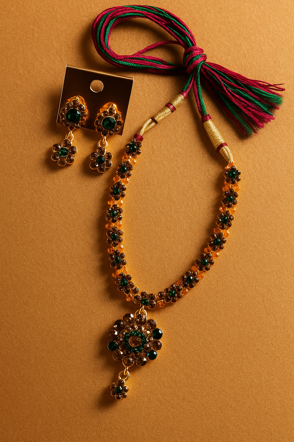 Elevate your ethnic look with this Floral Stone-Studded Necklace & Earring Set, beautifully crafted with sparkling golden and green stones. The intricate floral design symbolizes elegance and tradition, making it a perfect choice for weddings, festive occasions, and cultural celebrations.