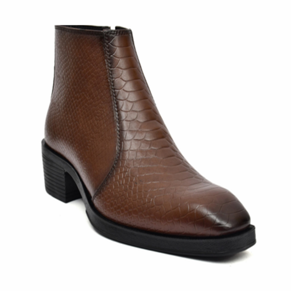 Step into timeless elegance with the Shapesin Men's Textured Brown Leather Ankle Boots. Crafted from premium faux leather with a refined croc-embossed texture, these boots add a touch of luxury to your everyday look. The side zipper ensures easy wear, while the cushioned insole and durable rubber sole offer long-lasting comfort and traction. Perfect for both formal and casual occasions, these boots are a versatile wardrobe essential for the modern gentleman.
