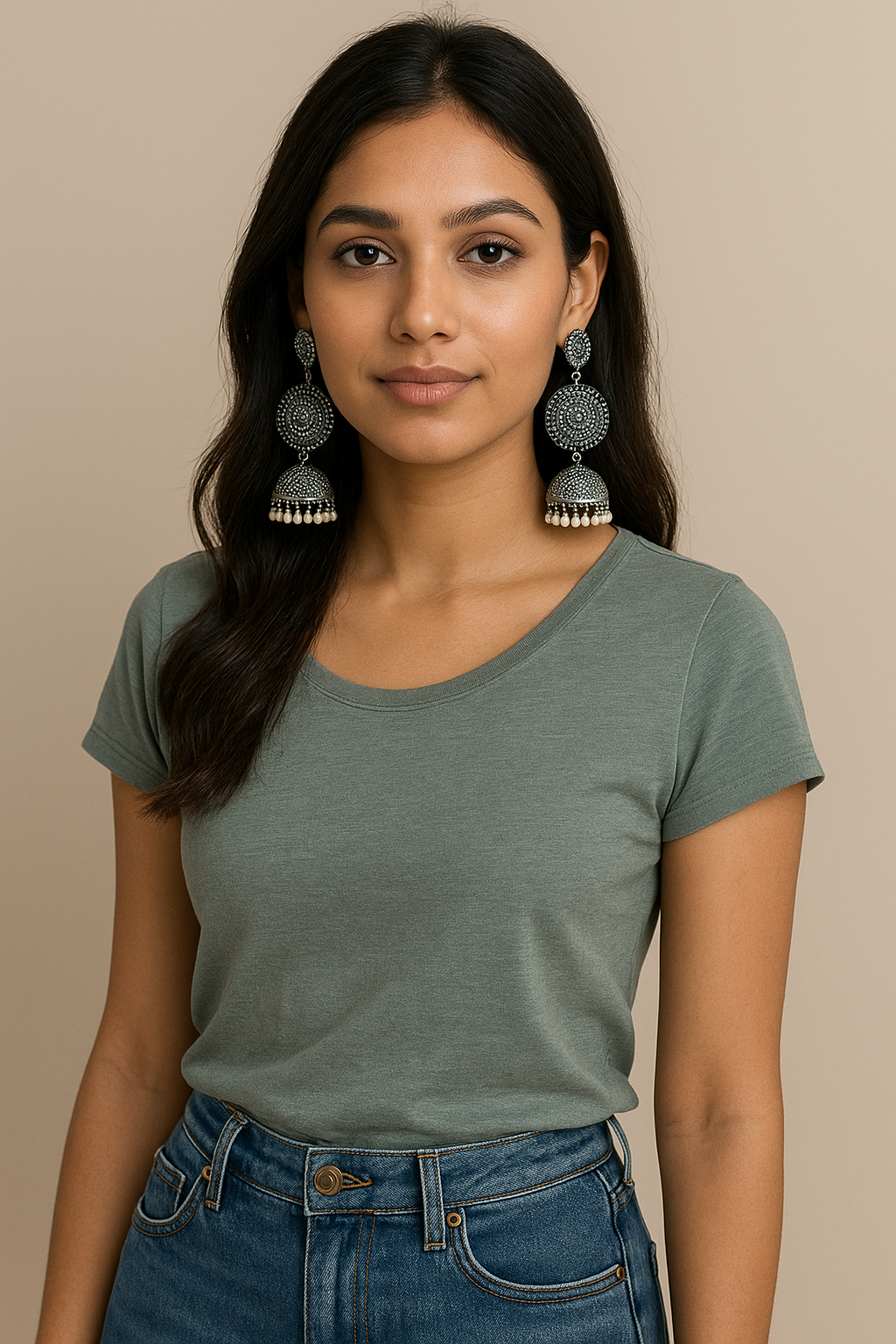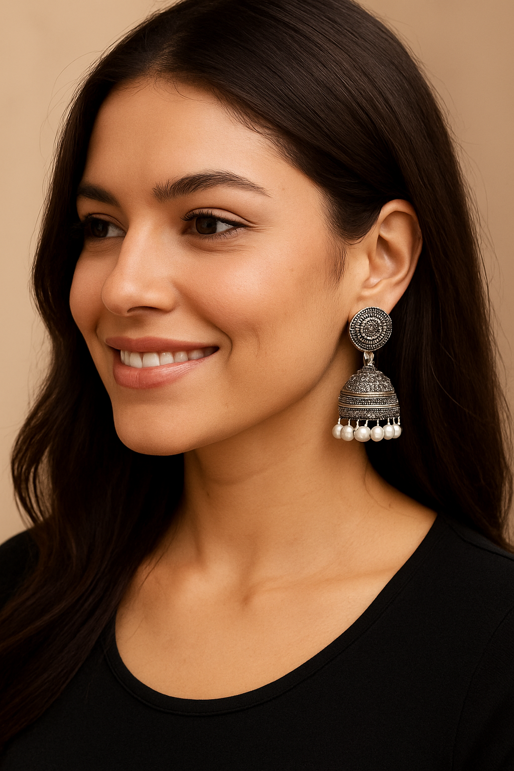 Elevate your ethnic style with these Antique Silver-Plated Jhumka Earrings, featuring intricate handcrafted detailing and delicate pearl drops. Perfect for weddings, festive occasions, and traditional gatherings, these earrings blend timeless elegance with artisanal charm. Their lightweight design ensures comfort, while the vintage gold polish adds a touch of regal sophistication. Pair them with sarees, lehengas, or ethnic suits to complete your look.