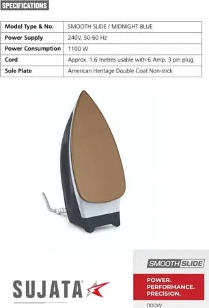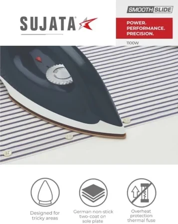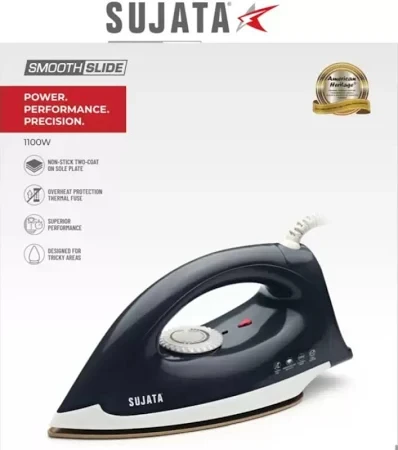 The Sujata by Sujata Non-Stick Smooth Slide Dry Iron is designed to make ironing simple, safe, and efficient. Available in 1100W and 750W variants, this iron provides quick and even heating for all fabric types. Its non-stick coated soleplate ensures effortless gliding without sticking or burning clothes. The temperature control knob allows you to adjust heat precisely according to fabric type — from delicate silks to heavy cotton. Compact, durable, and easy to use, the Smooth Slide Dry Iron offers comfortable handling, energy efficiency, and consistent performance, making it ideal for daily use.