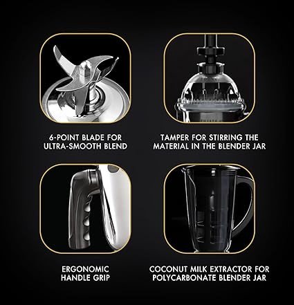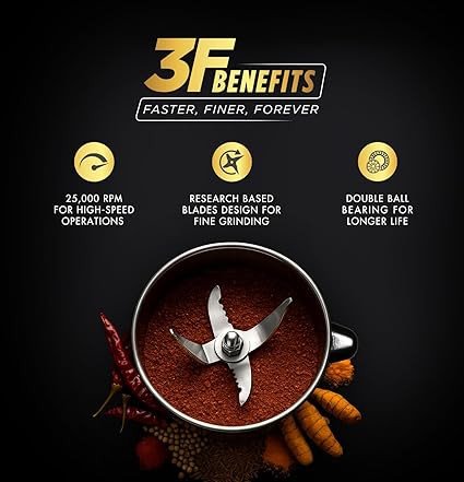 Unleash superior performance with the Sujata MG03 Mixer Grinder, equipped with a powerful 1000W double ball bearing motor for efficient and long-lasting operation. Delivering an impressive 25,000 RPM, it ensures fast and fine grinding every time. The set includes 4 jars – a 1750ml blender with a coconut milk extractor, 1500ml wet jar, 1000ml dry jar, and 500ml chutney jar. Designed for 90 minutes of continuous running, this mixer grinder guarantees smooth blending and durability. The elegant black finish adds a modern touch to your kitchen.