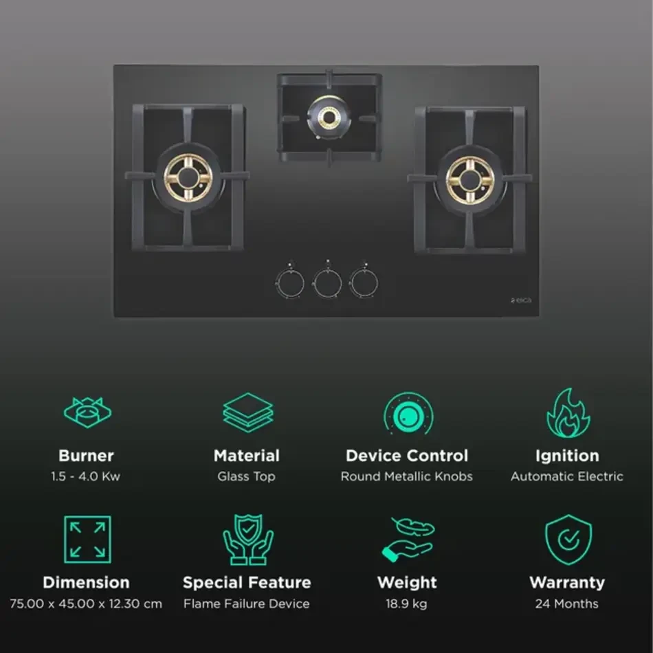 The Auto Ignition System ensures hassle-free operation, while the Flame Failure Device (FFD) enhances safety by automatically shutting off gas in case the flame goes out. Built with 8 mm black toughened glass, heavy-duty cast iron pan supports, and ergonomic metal knobs, this hob combines durability with a sleek, modern design.
