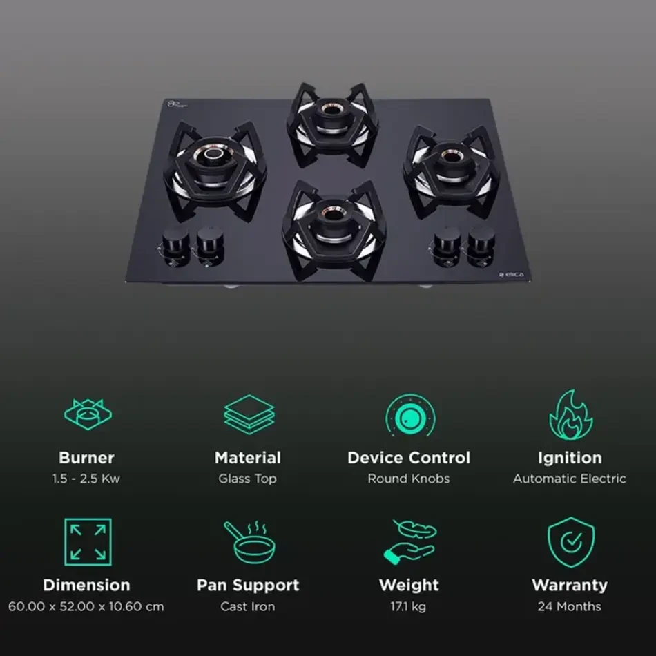 The sleek black toughened glass finish adds elegance while offering easy cleaning, and the cast iron pan supports provide stability for all cookware. With auto electric ignition and ergonomic metallic knobs, it combines safety, performance, and style in one appliance.