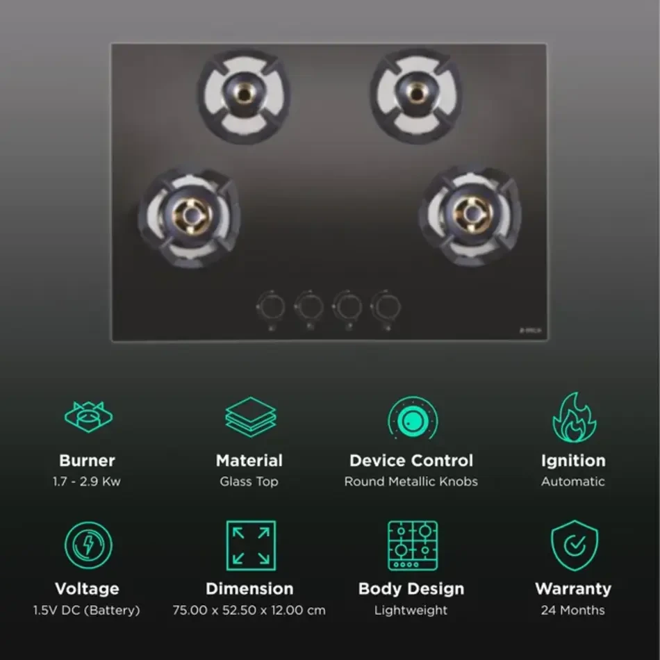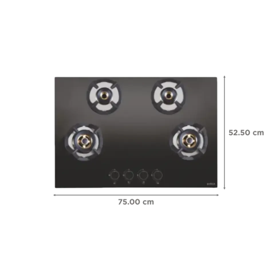 The toughened black glass top offers a premium look with high resistance to heat and scratches, while the auto electric ignition adds a seamless cooking experience. Heavy-duty cast-iron pan supports ensure stability and longevity, even with large utensils.