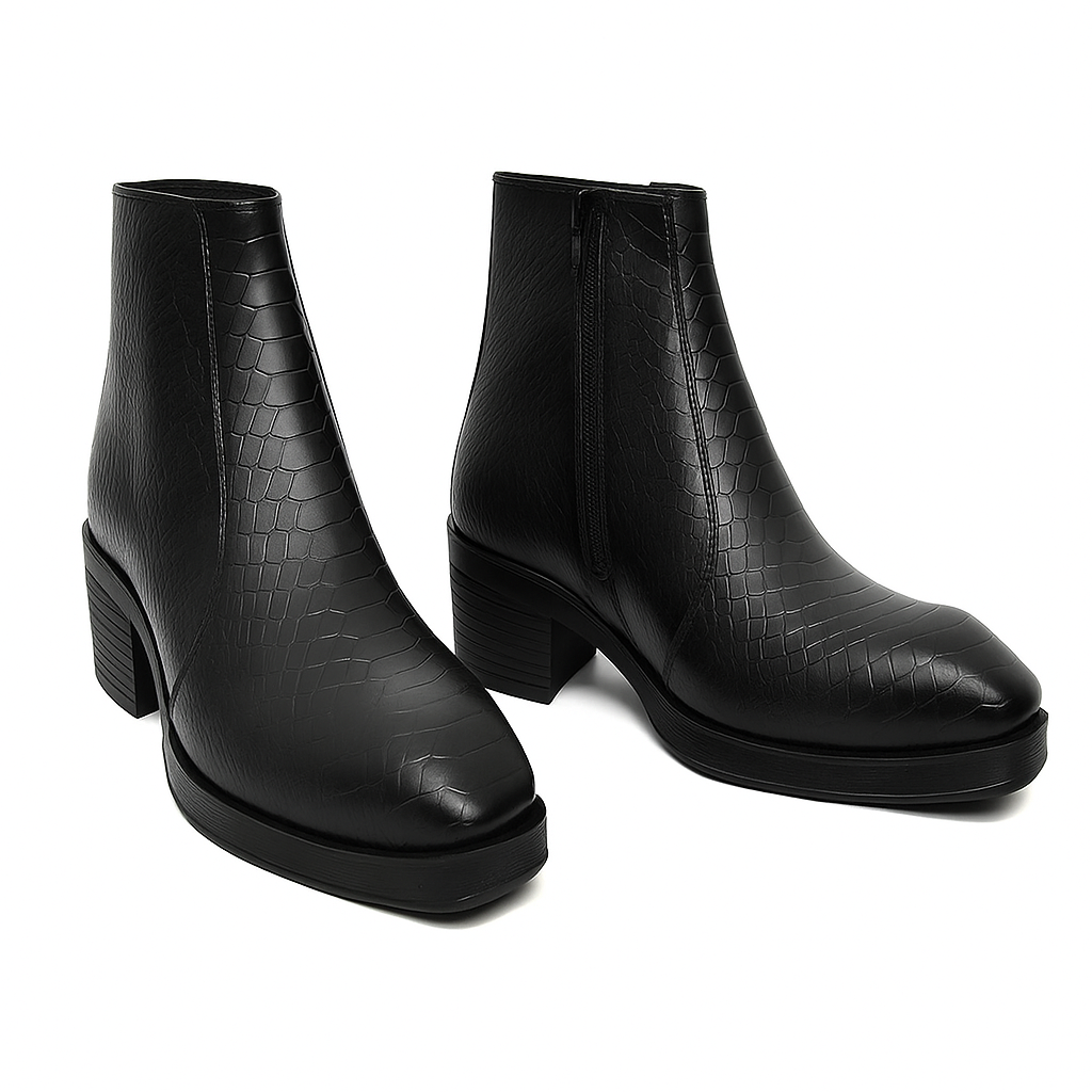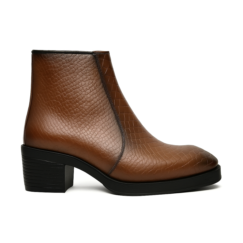 Step into timeless elegance with the Shapesin Men's Textured Brown Leather Ankle Boots. Crafted from premium faux leather with a refined croc-embossed texture, these boots add a touch of luxury to your everyday look. The side zipper ensures easy wear, while the cushioned insole and durable rubber sole offer long-lasting comfort and traction. Perfect for both formal and casual occasions, these boots are a versatile wardrobe essential for the modern gentleman.