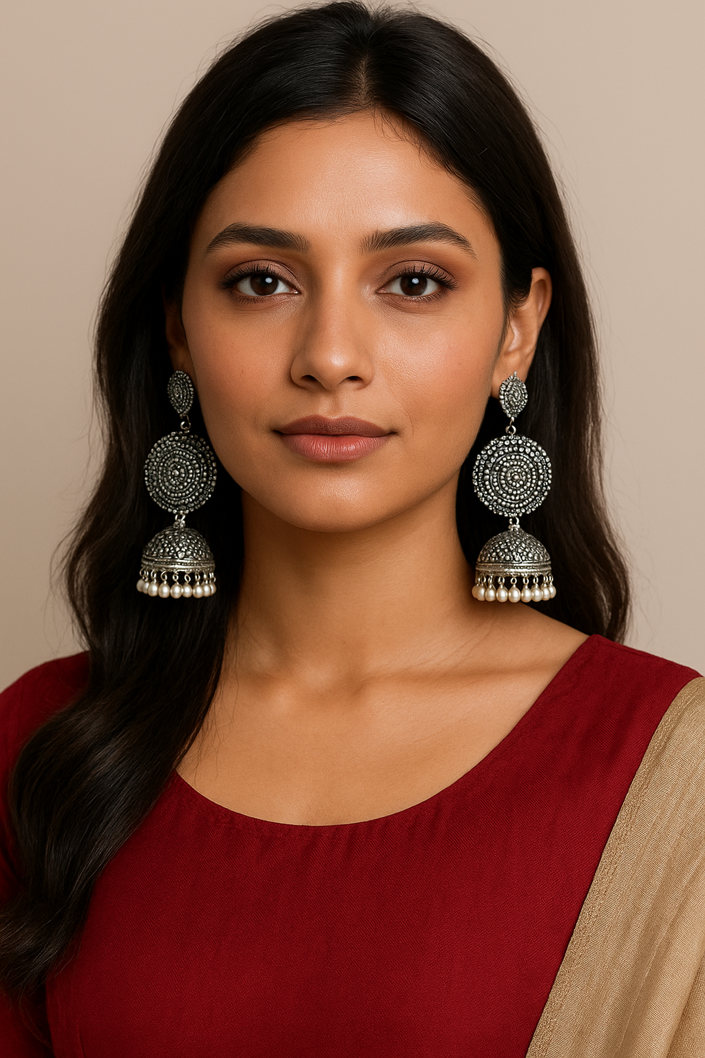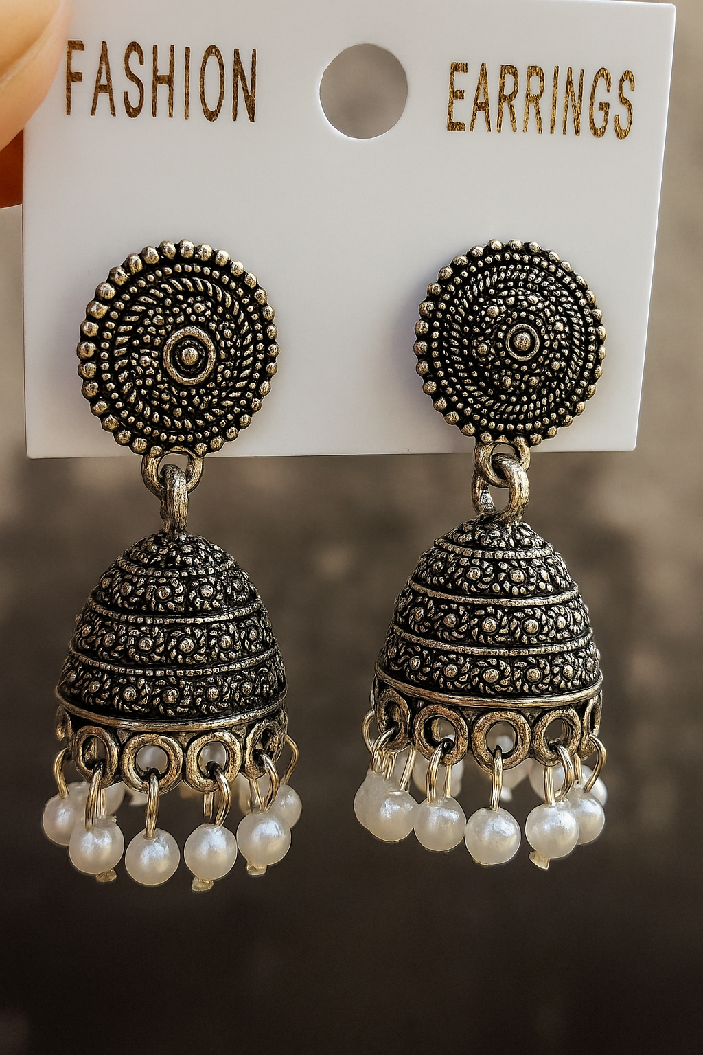 Elevate your ethnic style with these Antique Silver-Plated Jhumka Earrings, featuring intricate handcrafted detailing and delicate pearl drops. Perfect for weddings, festive occasions, and traditional gatherings, these earrings blend timeless elegance with artisanal charm. Their lightweight design ensures comfort, while the vintage gold polish adds a touch of regal sophistication. Pair them with sarees, lehengas, or ethnic suits to complete your look.