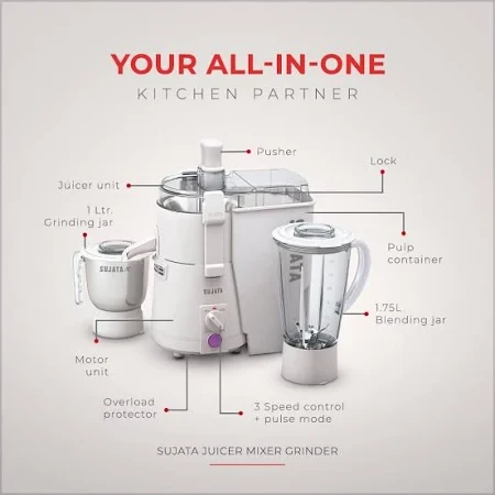 The Sujata Powermatic Plus Juicer Mixer Grinder is engineered for superior performance, durability, and convenience. Powered by a robust 900-watt double ball bearing motor, it delivers 22,000 RPM for high-speed, efficient juicing, mixing, and grinding. Designed for continuous 90-minute operation, it ensures consistent performance without overheating. The stainless steel blades and durable jars guarantee perfect texture and smooth results for all your recipes. Ideal for fruits, vegetables, spices, and batters, the Powermatic Plus offers unmatched power, reliability, and long-lasting performance—perfect for home and commercial kitchens alike.